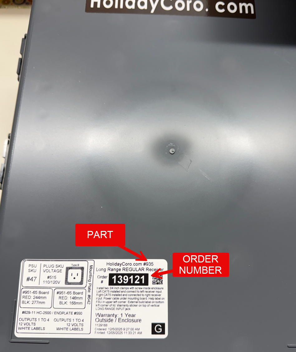 ISSUE: You have likely been directed to this page as HolidayCoro needs your order and/or part number for the product you are seeking assistant or support with. This page shows all the common labels and locations.